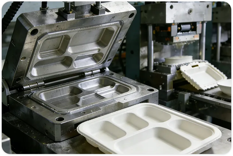 Create unique disposable food containers with any shape, size, or number of compartments. From single-compartment containers to complex multi-section trays, we bring your vision to life with our expert custom mold forming capabilities.